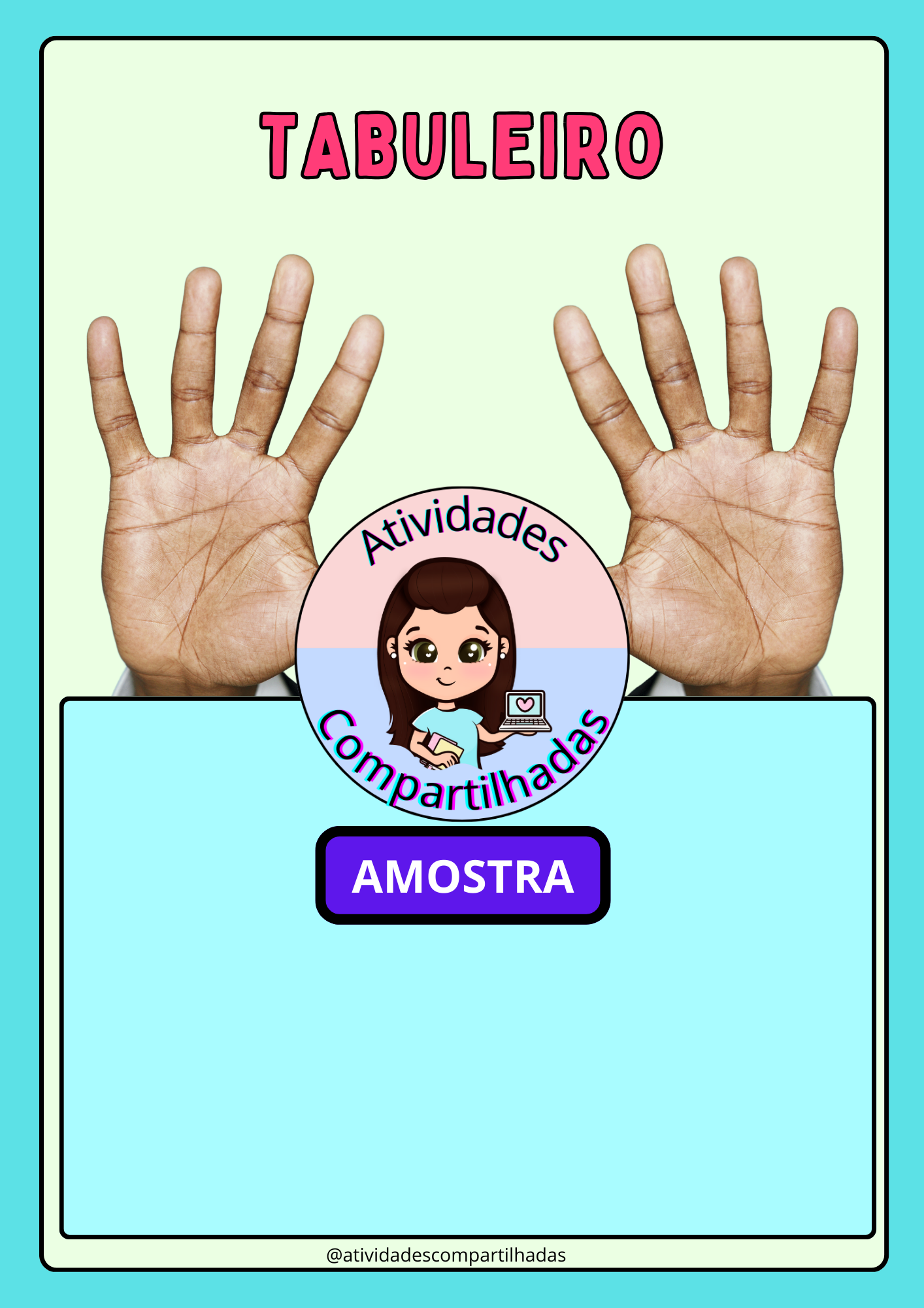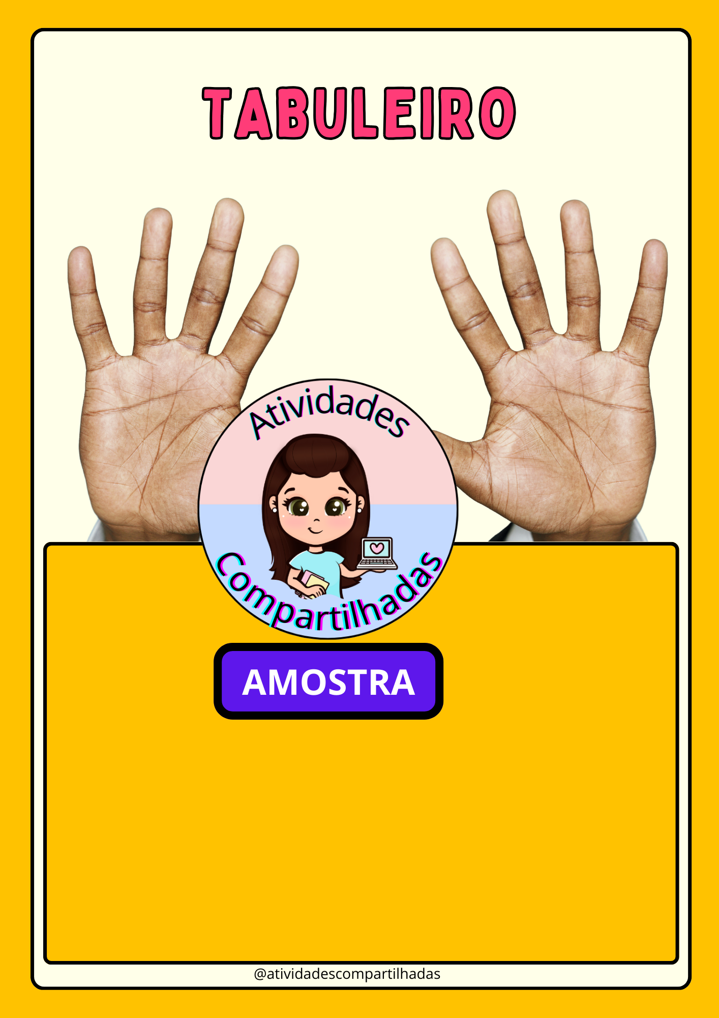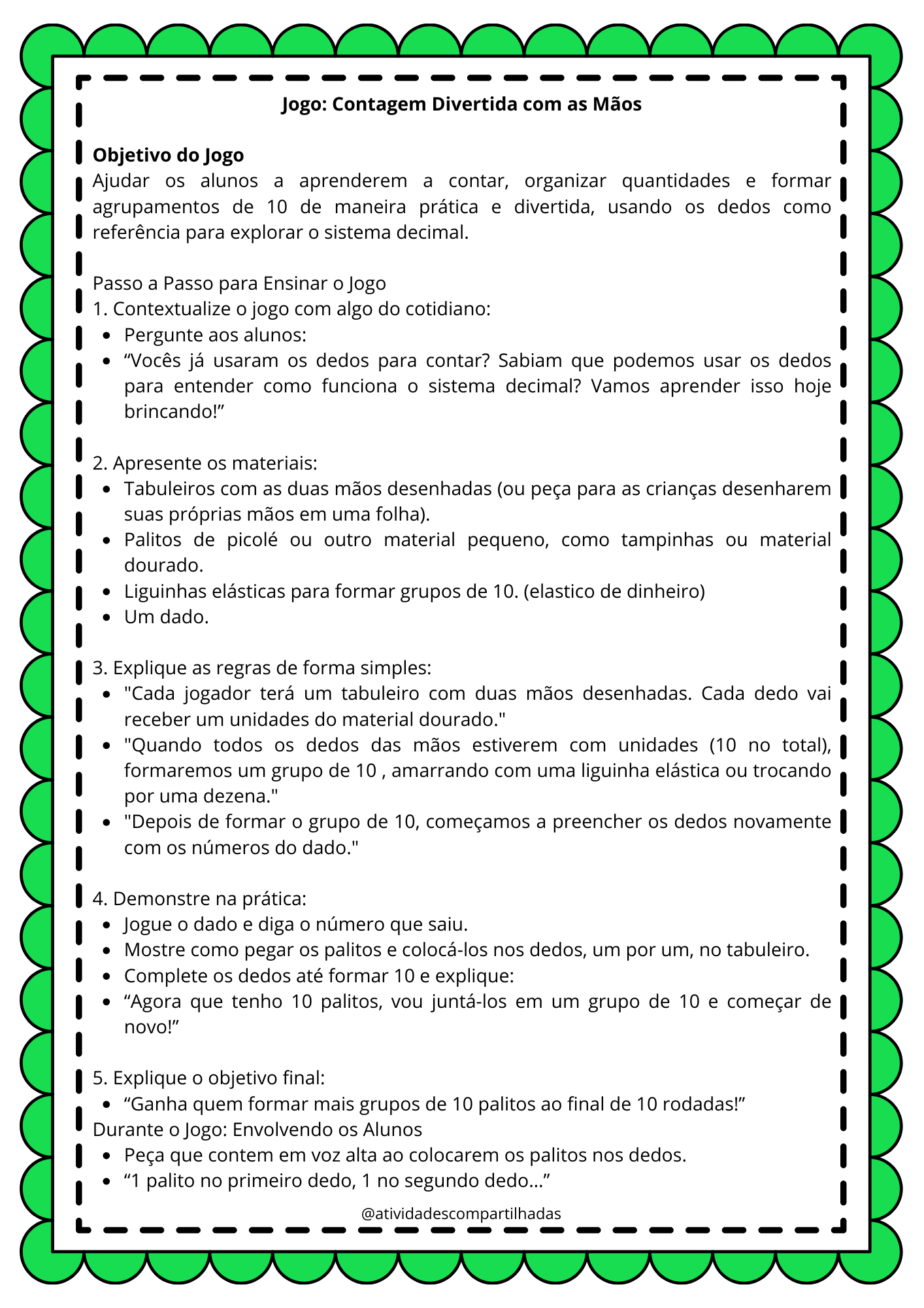 📦 Materiais simples: tabuleiro com mãos desenhadas, palitos, dado e liguinhas.