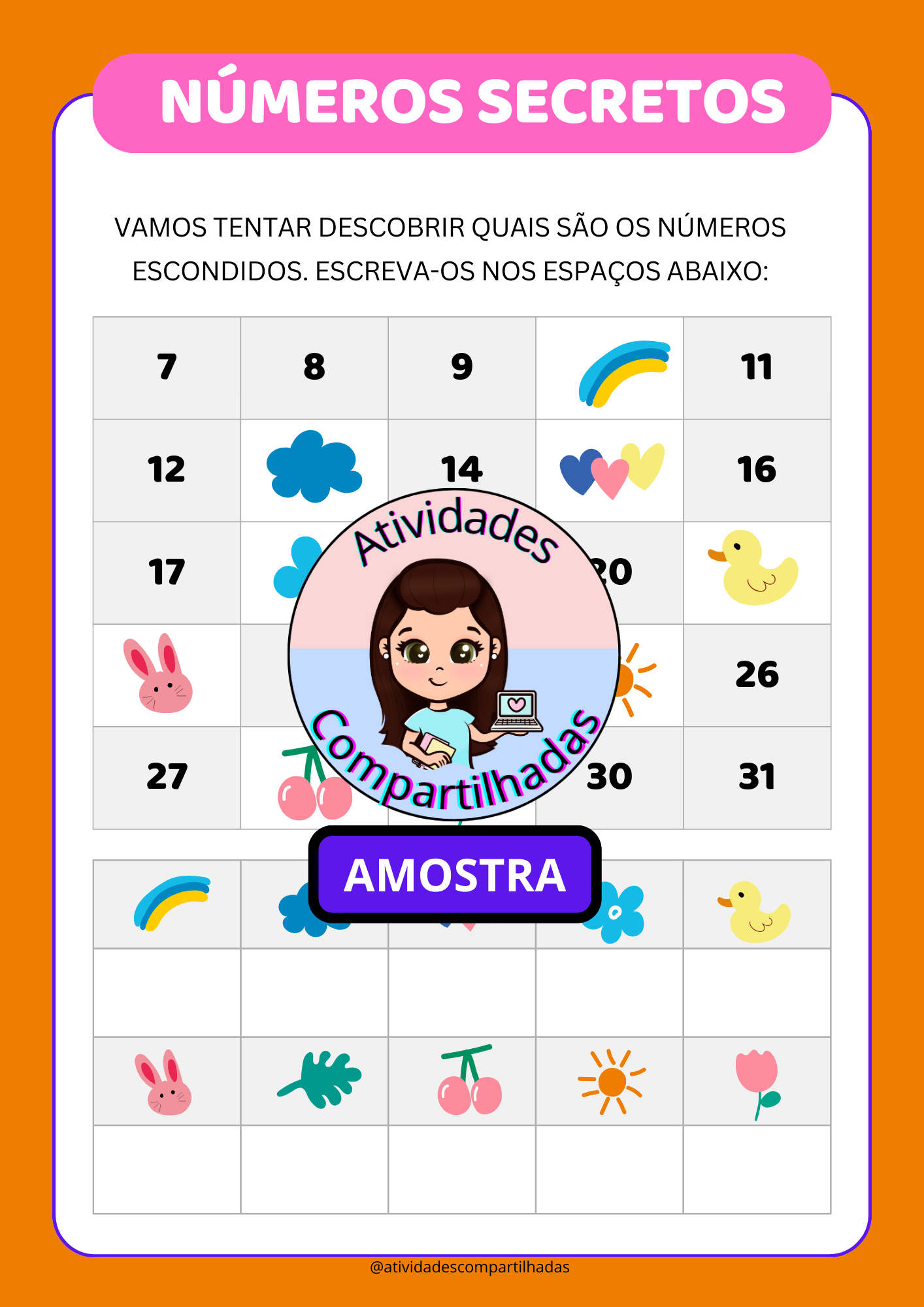 Que tal desafiar os alunos com uma atividade envolvente e cheia de cores? 🌈✨ Com os Números Secretos, eles precisam observar as sequências e descobrir quais números estão escondidos pelos desenhos!